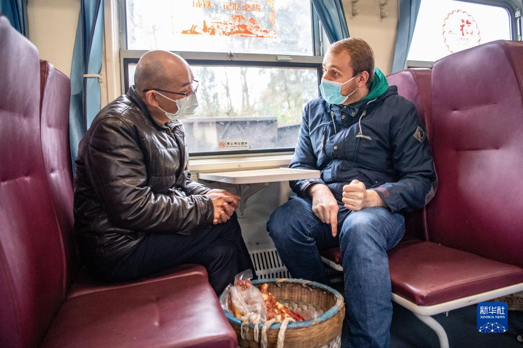 马丁(右)在“慢火车”车厢内和采购年货的老乡拉家常(1月27日摄)。