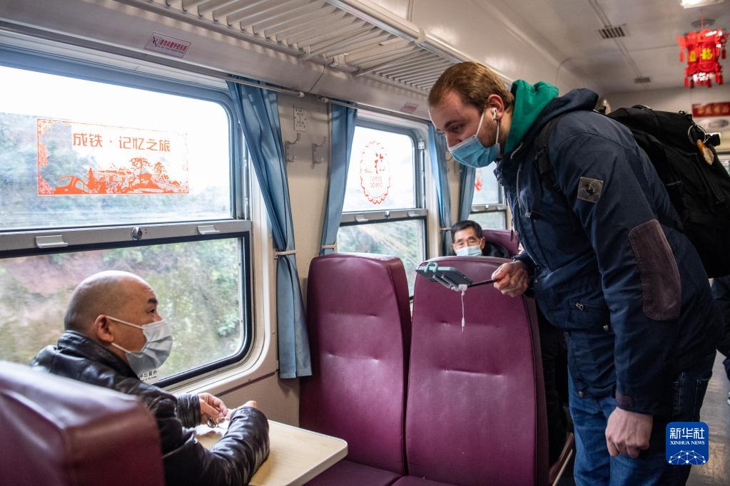 在成渝铁路线上的“慢火车”车厢里,马丁(右)一边开着抖音直播,一边和老乡拉家常(1月27日摄)。