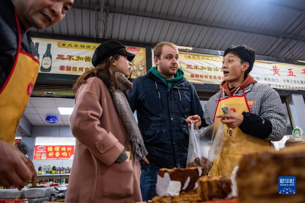 马丁(中)在何埂镇集市上“赶集”挑选年货(1月27日摄)。