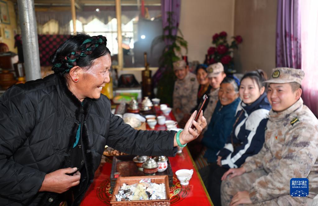 达吉阿妈(左)在与退伍20多年的一名贵州籍战士视频聊天(1月26日摄)。