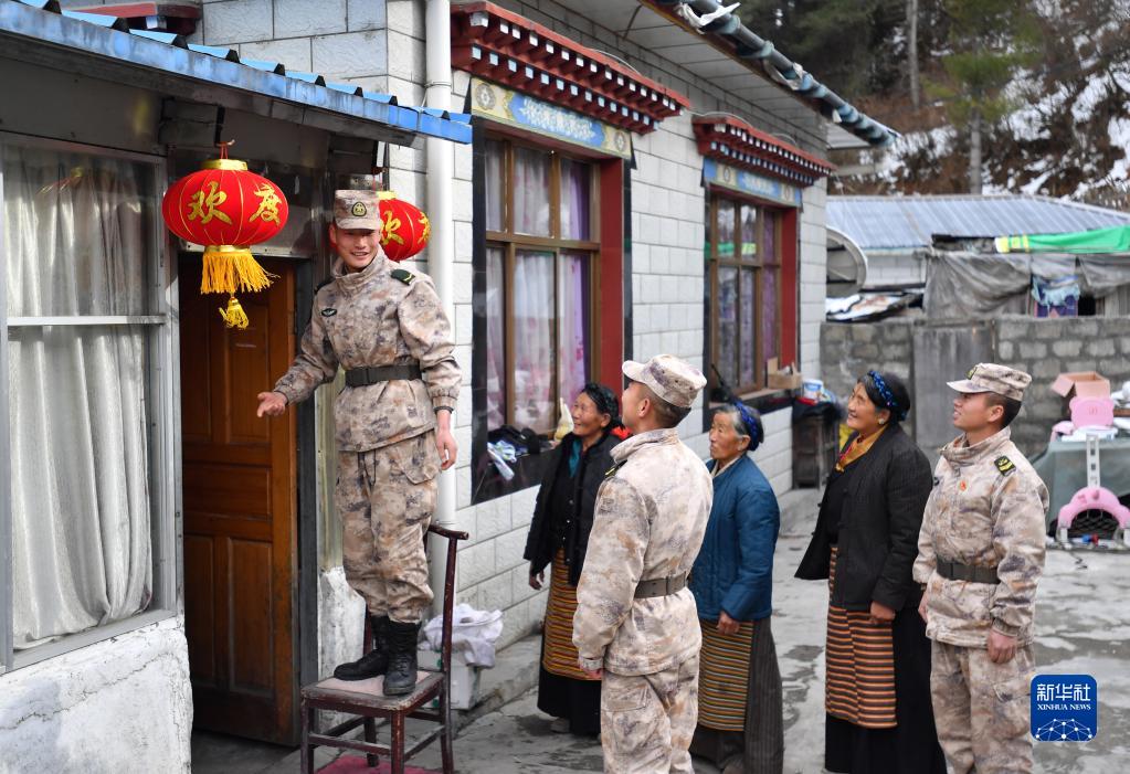 当地官兵到仁青岗村为三位老阿妈装点房屋,准备迎接春节(1月26日摄)。