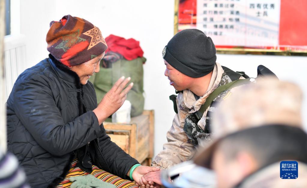 老阿妈达吉在和战士聊家常(1月27日摄)。