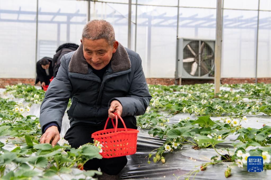 杨建庆在大天池村的“桃韵天池”草莓基地种植大棚内采摘草莓(1月29日摄)。