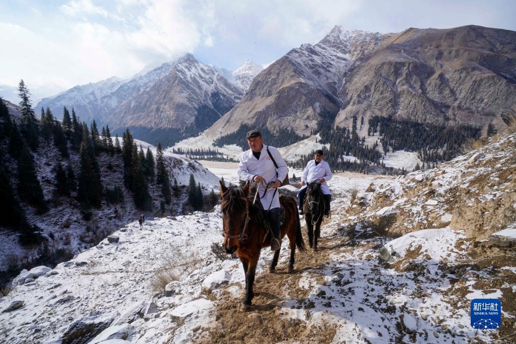 在新疆昭苏县的冬季牧场阿合牙孜沟,牧业医院的医生骑马巡诊(1月25日摄)。
