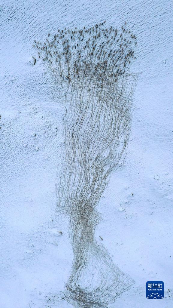 在新疆昭苏县阿合牙孜沟,牧民赶着羊群上山吃草(1月25日摄,无人机照片)。