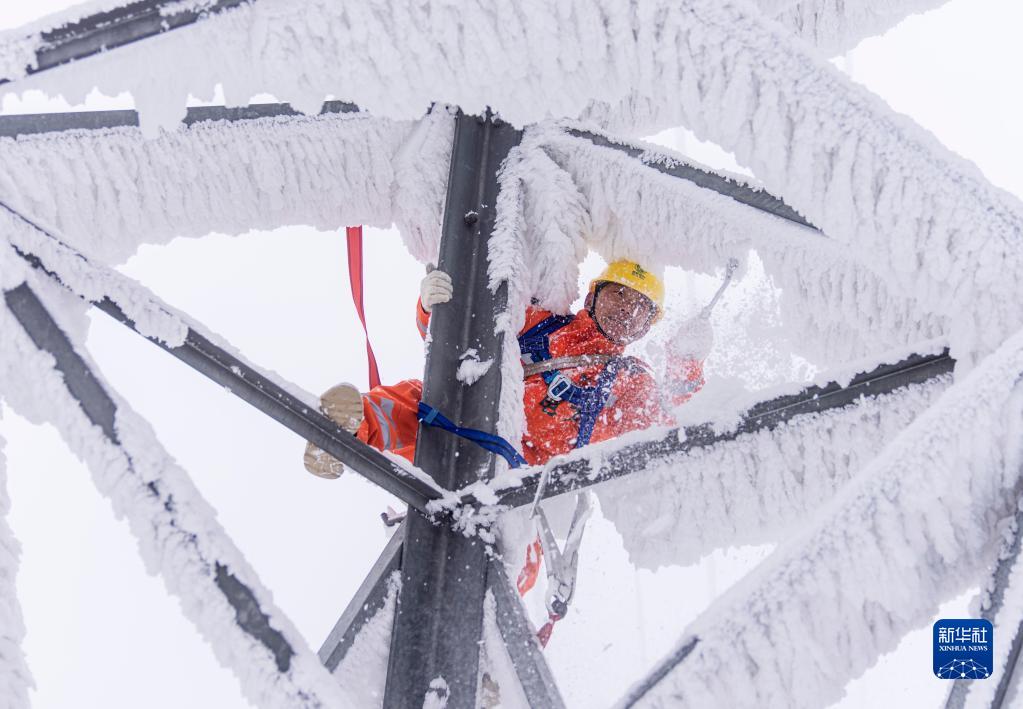 1月29日,应急抢险人员在湖北省恩施土家族苗族自治州鹤峰县走马镇清除电力线路冰雪。