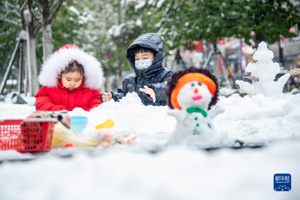 2月7日,小朋友在江汉路街道旁堆雪人。