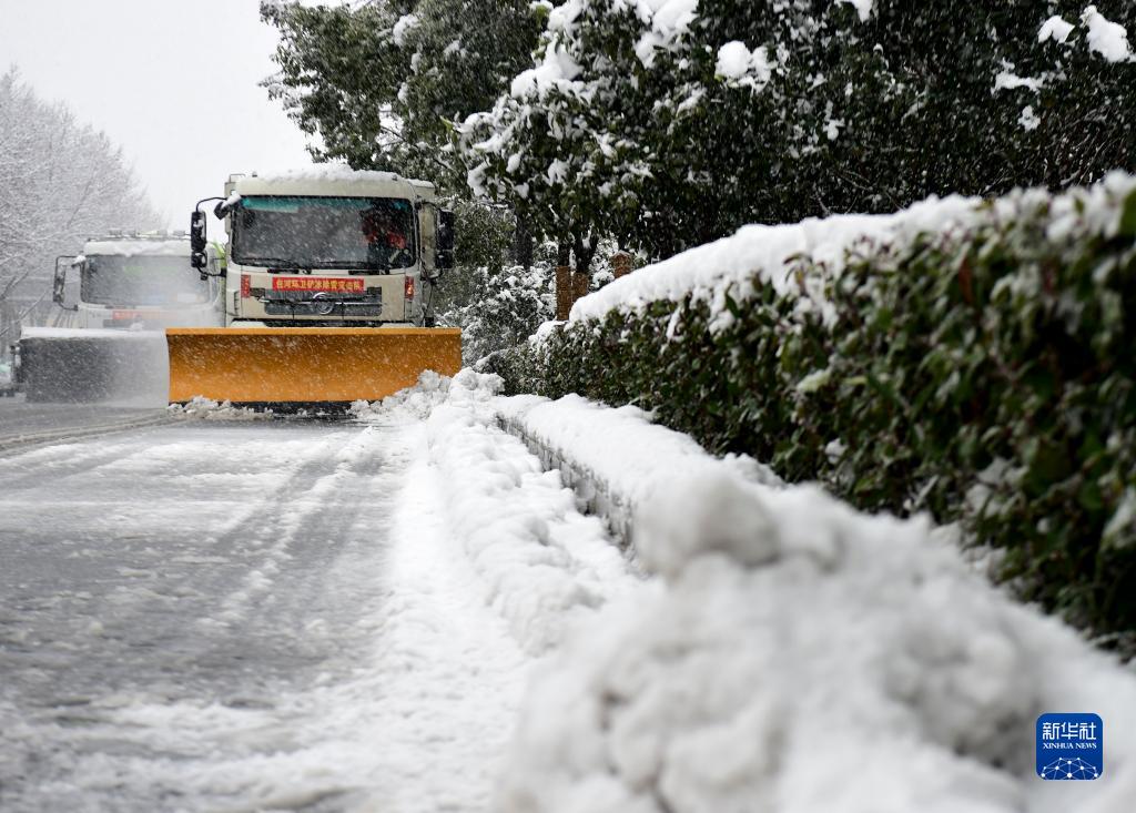 当日,合肥出现降雪天气,路面出现积雪现象。相关部门组织工人和大型器械除雪铲冰,保障市民出行安全。