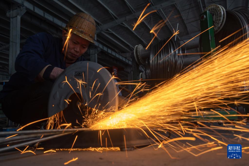 2月7日,工人在浙江省丽水市景宁畲族自治县一洁净钢管有限公司切割车间切割无缝不锈钢管。