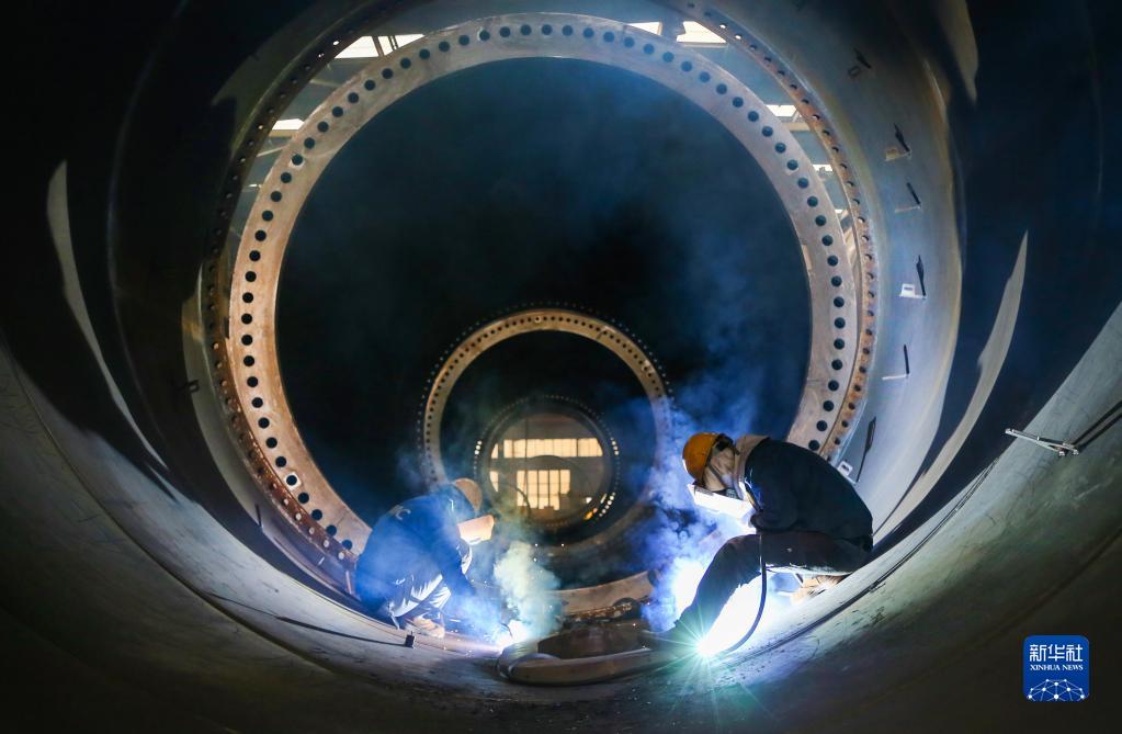 2月7日,在江苏连云港经济技术开发区一家风力设备公司车间,工人在生产风力塔架。