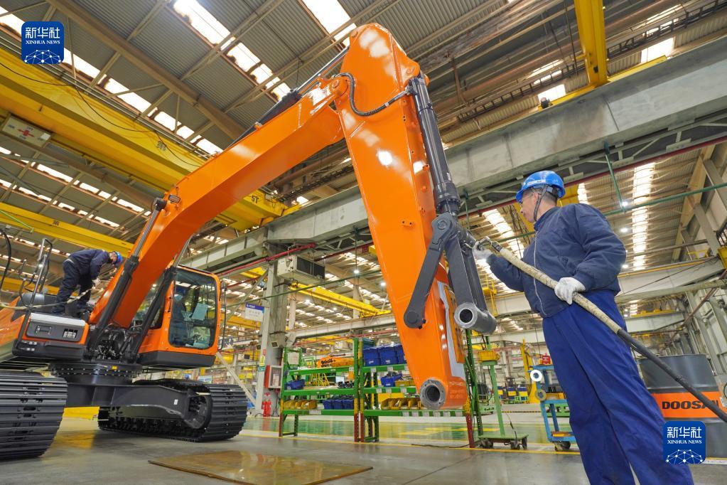 2月7日,在山东烟台一家工程机械生产企业,工人在生产车间内忙碌。