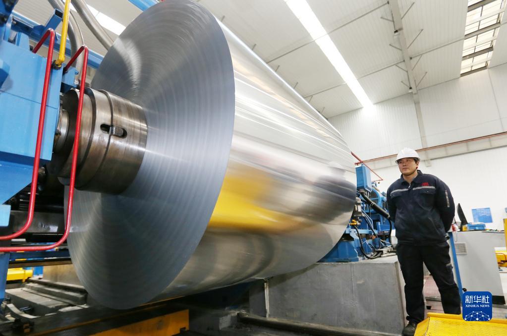 2月7日,工人在安徽省淮北市濉溪经济开发区一家电池铝箔加工企业生产车间作业。