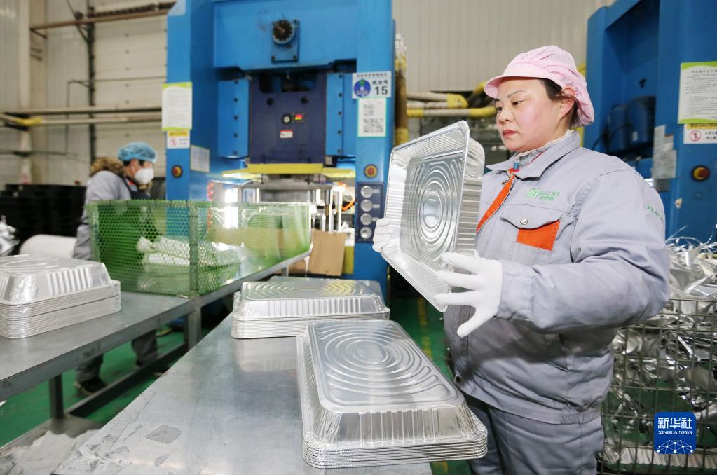 2月7日,工人在安徽省淮北市濉溪经济开发区一家铝箔餐盒加工企业生产车间忙碌。
