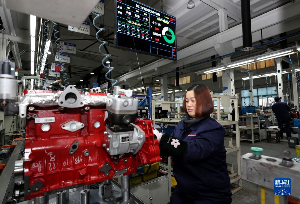 2月7日,在安徽全柴集团有限公司,工人在组装生产发动机。