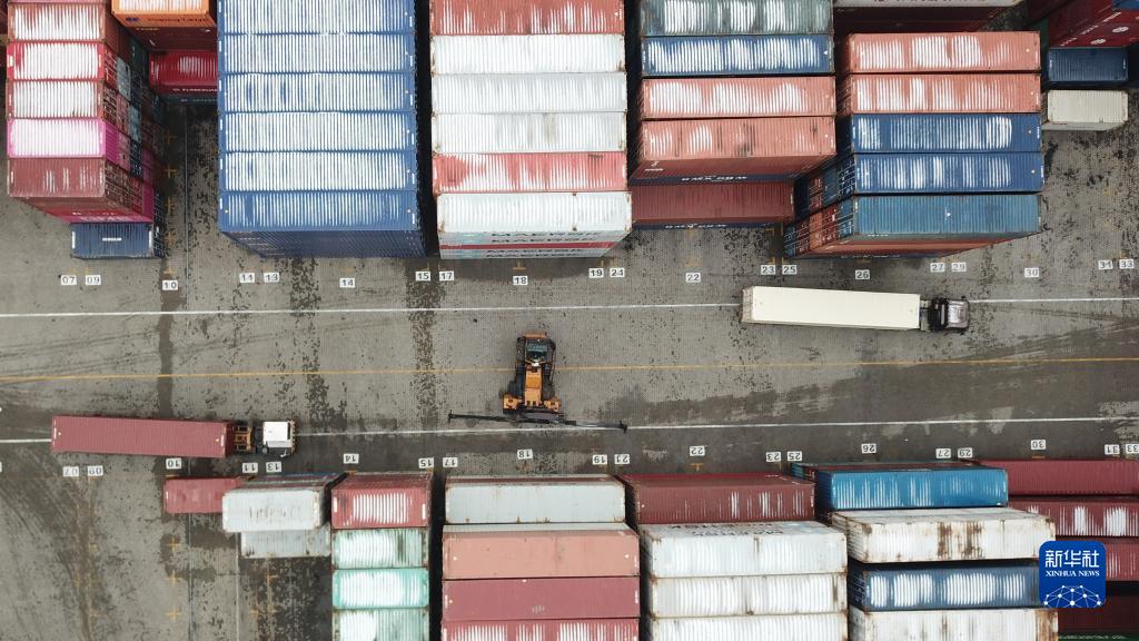 2月8日,装载货物的车辆在长沙新港内行驶(无人机照片)。