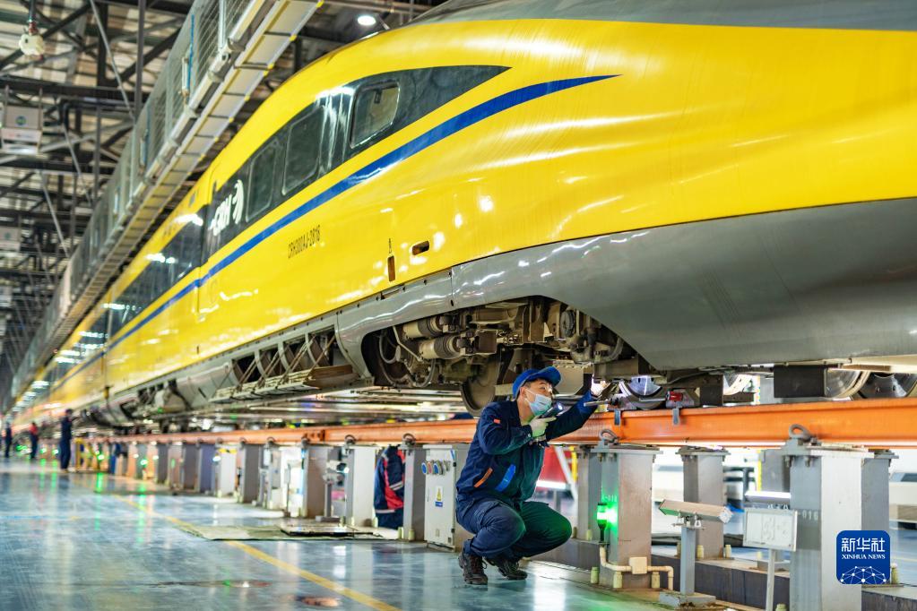 2月7日,中国铁路郑州局集团有限公司郑州动车段动车组机械师对综合检测列车转向架状态进行检查。