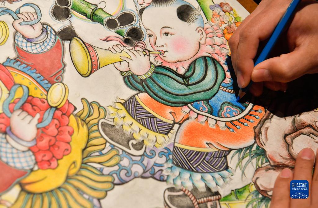2月10日,天津杨柳青画社青年传承人在为其创作的年画作品进行彩绘。