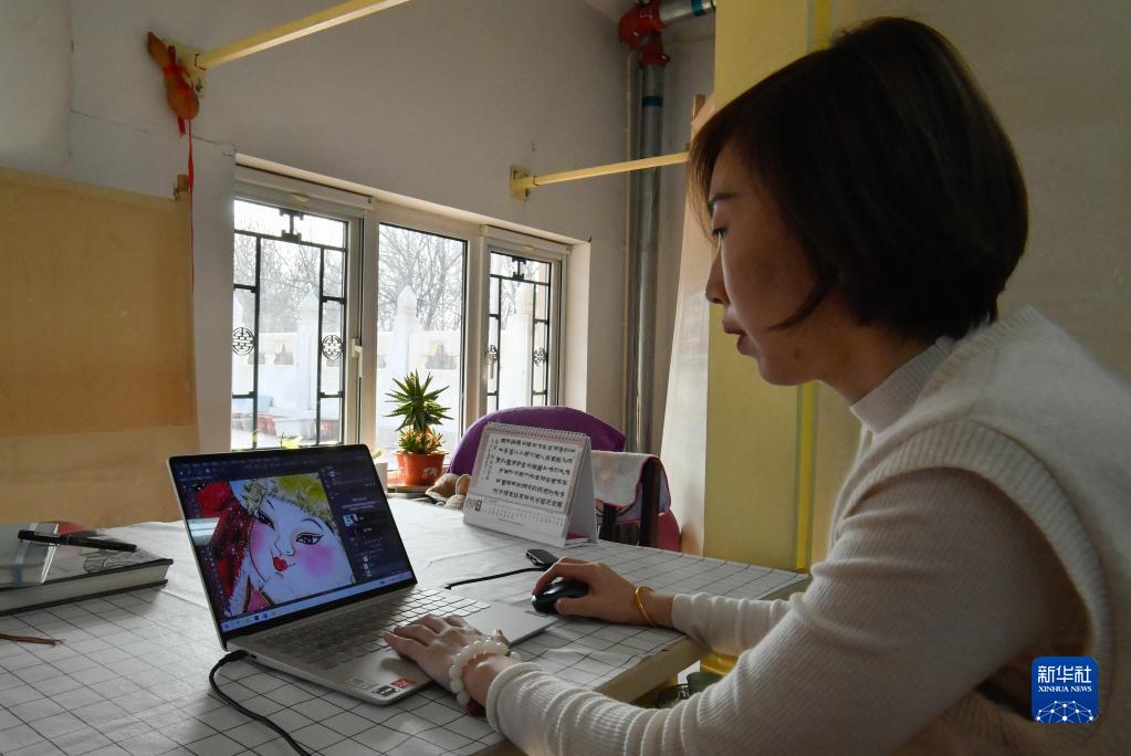 2月10日,天津杨柳青画社青年传承人王艳在彩绘工作室利用软件修改年画细节。