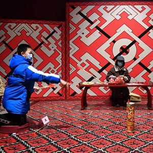 2月10日,小朋友们在长沙博物馆体验投壶。