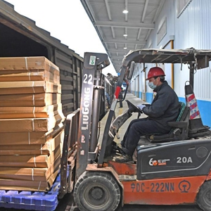2月10日,工作人员在南宁国际铁路港从卡车上卸下援助百色市的应急物资,准备装上专列。
