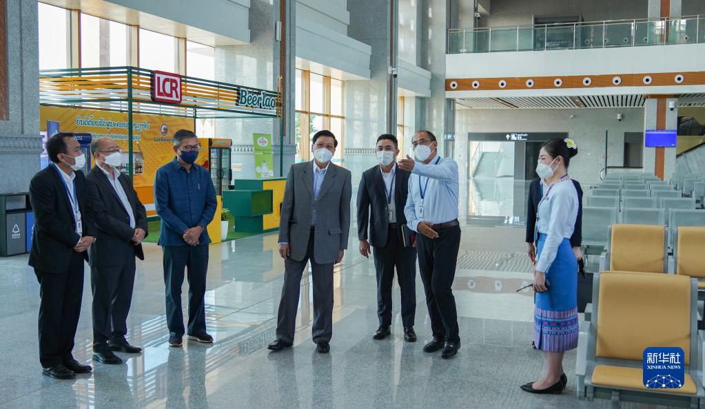 2月7日,老挝人民革命党中央总书记、国家主席通伦(左四)视察中老铁路万象站候车大厅。