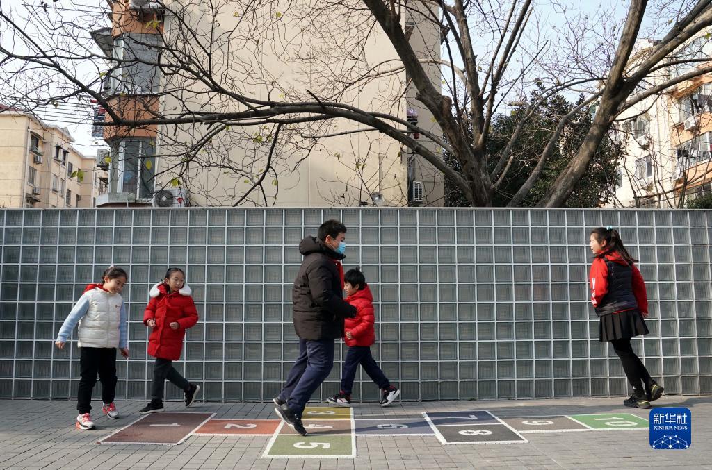 1月18日,在上海市徐汇区凌云街道凌云新村社区,孩子们在玩传统游戏——跳房子。新华社记者 刘颖 摄