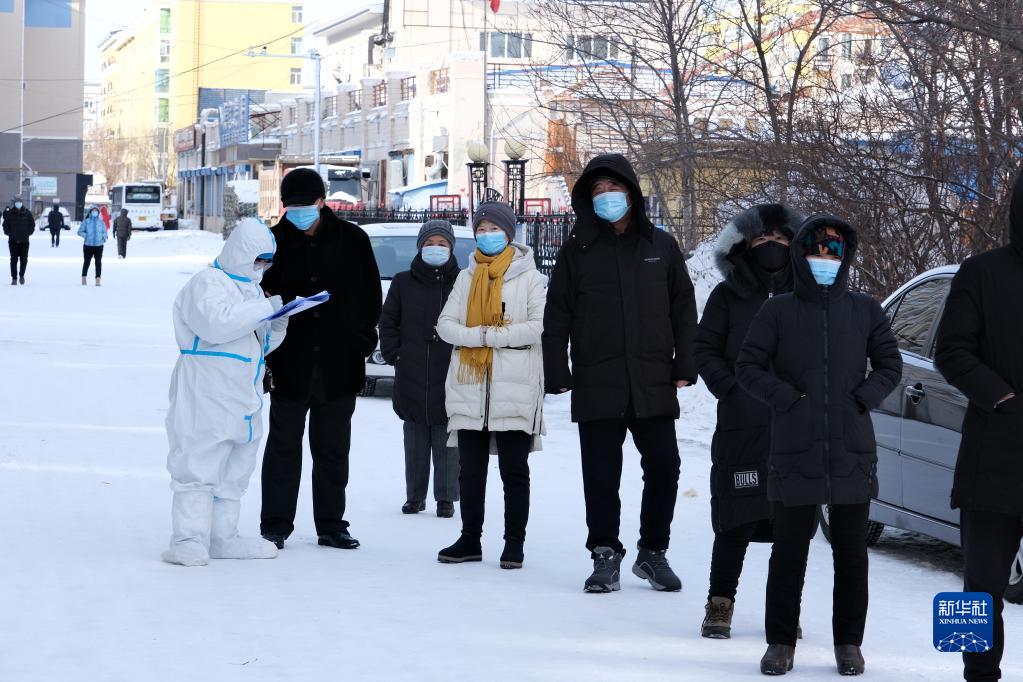 2月11日,黑河市世纪花园小区居民排队等待接受核酸检测。