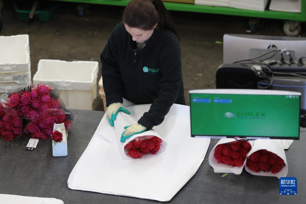 2月11日,在荷兰厄伊特霍伦的荷氏花卉贸易公司,一名工作人员包装鲜花。