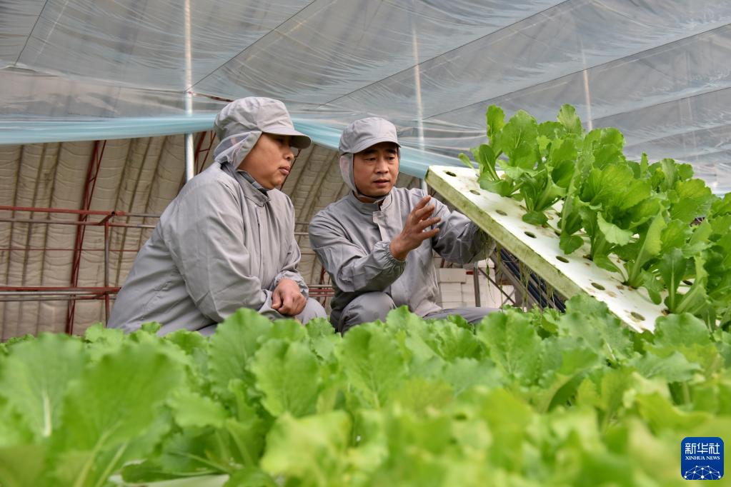 2月12日,张兆科(右)在为工人讲解水培蔬菜管理技术。