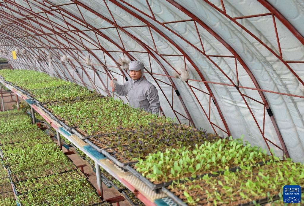 2月12日,张兆科在温室大棚内为蔬菜秧苗浇水。