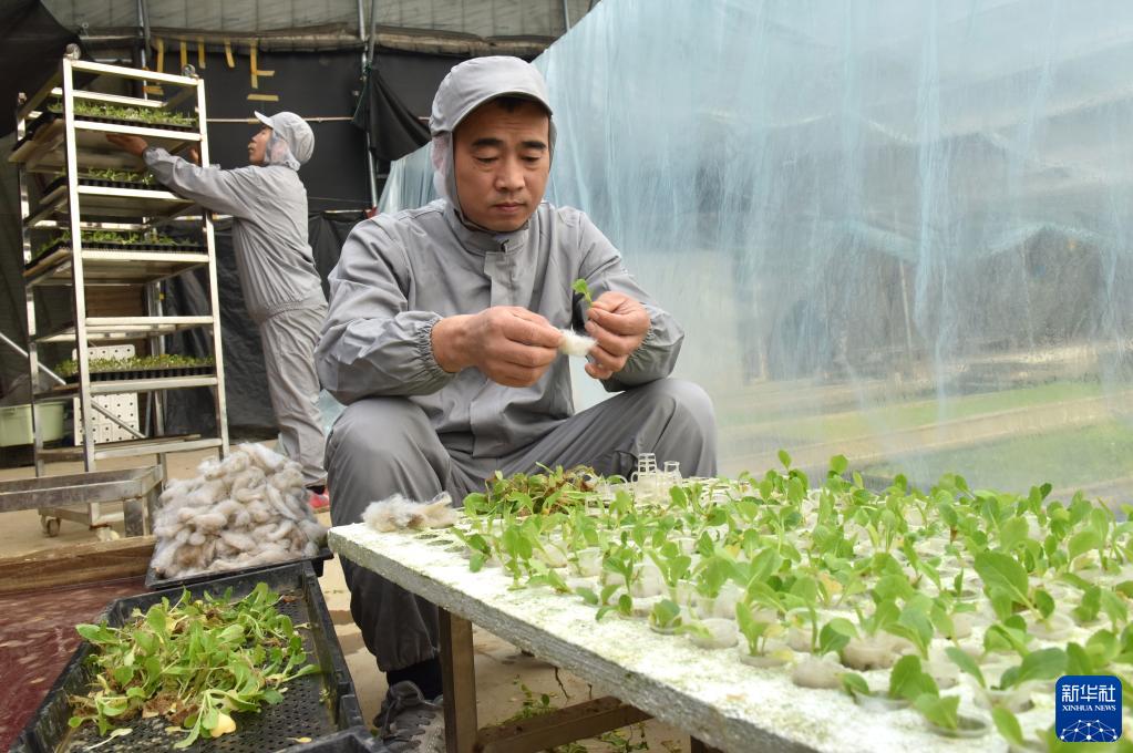 2月12日,张兆科(前)在温室大棚内管护蔬菜秧苗。