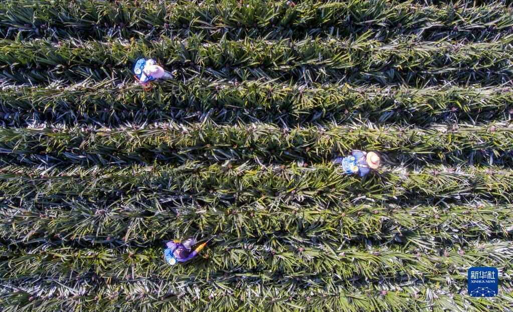 2月12日,海南省琼海市潭门镇的农民在菠萝基地杀菌灭虫(无人机照片)。