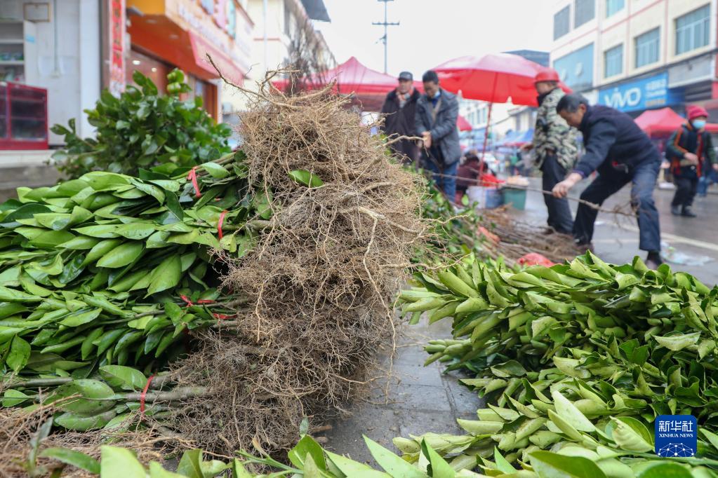 2月12日,村民在贵州省铜仁市玉屏侗族自治县田坪镇集市上选购树苗。