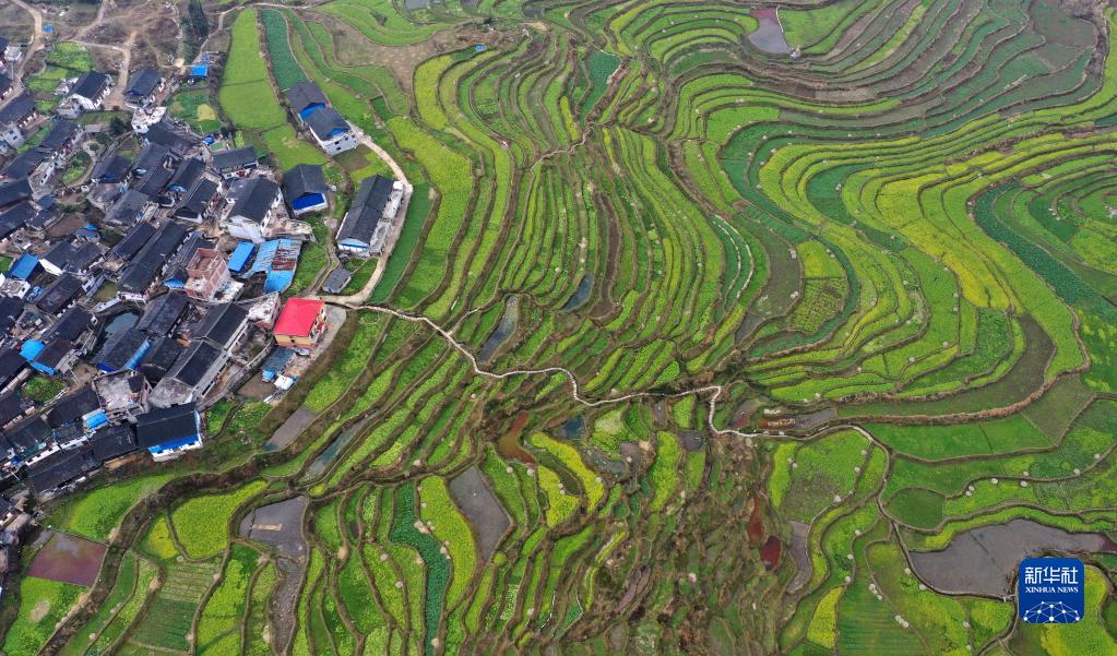 2月12日拍摄的贵州省丹寨县龙泉镇高要苗寨梯田(无人机照片)。