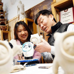 2月12日,济南陶塑非遗传承人王令涛(右)在教市民制作陶塑版“冰墩墩”。