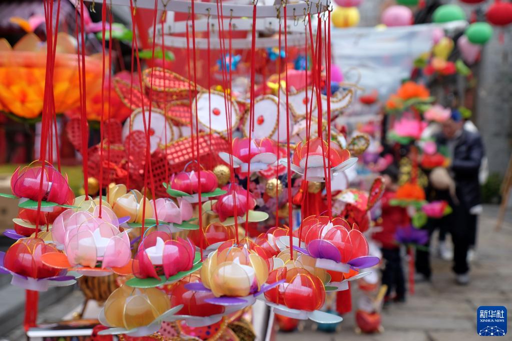 2月12日,市民在南京熙南里大板巷的笪桥灯市上选购花灯。