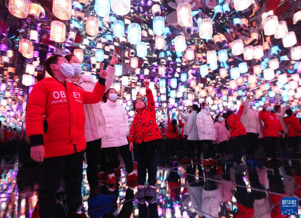 2月12日,游客在湖南省衡阳市南岳区祝融小镇的新春灯会上游玩。