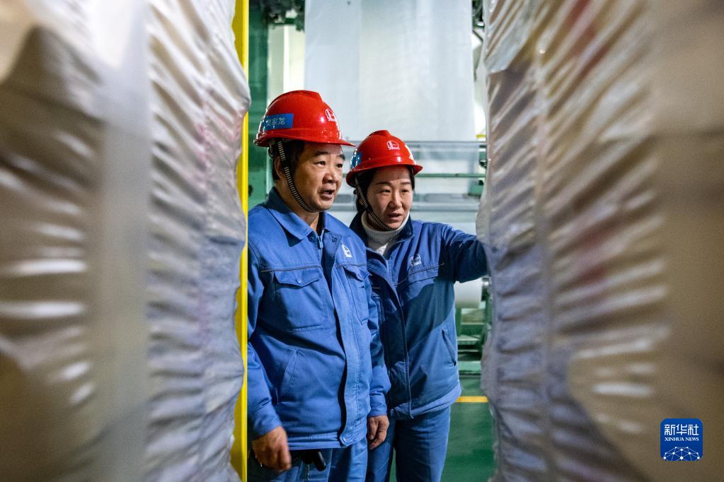 2月12日,工作人员在抽检PVA(聚乙烯醇)产品包装和打包情况。