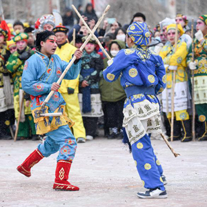 2月13日,在丰宁县黄旗镇黄旗东村文化广场,民间艺人表演“黄旗武会”。