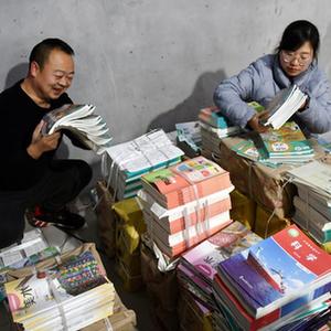 2月13日,在湖南省资兴市新华书店仓库,工作人员在清点教材。