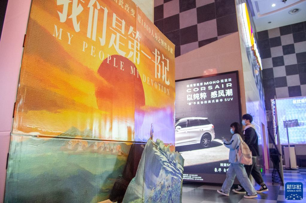 在武汉一家影城,观众从电影《我们是第一书记》海报旁走过(2021年12月3日摄)。