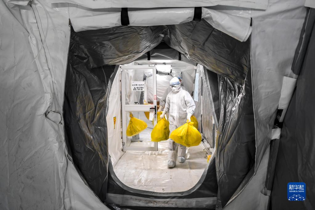 2月13日,工作人员在气膜实验室内转移医疗废弃物。