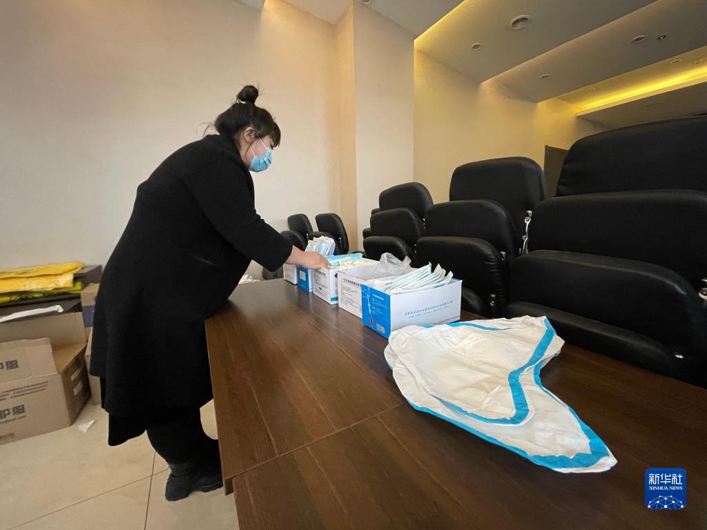 2月13日,绥中县圣畔海岸酒店集中隔离点工作人员在整理防疫用品(手机照片)。此隔离点是绥中县一处较大的隔离点,从2月9日开始一共接收了85位集中隔离人员。由医护人员、后勤保障人员和行政管理人员等13人组成的工作队24小时驻守。