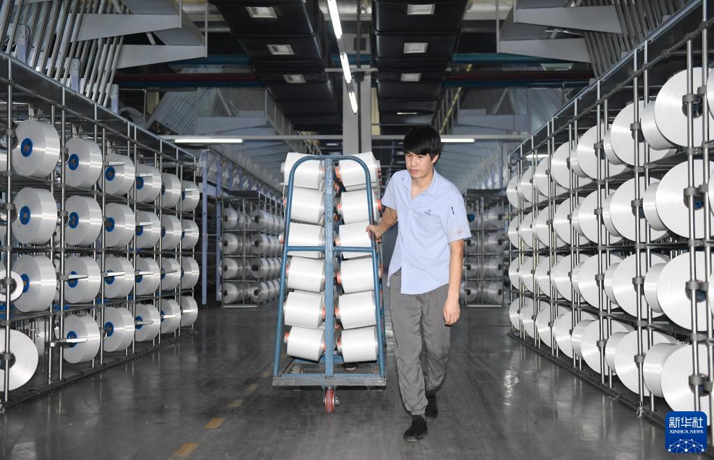 2月14日,在位于吴兴区八里店镇的华祥(中国)高纤有限公司,工作人员在生产车间运送产品。