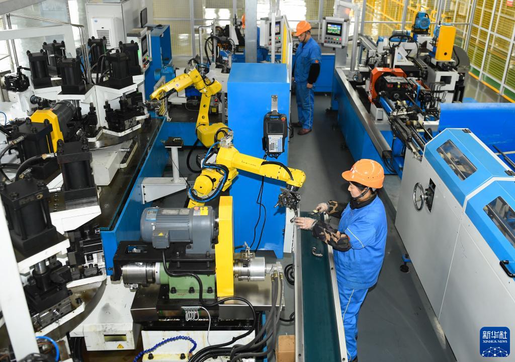 2月14日,在位于吴兴区八里店镇的金洲管道科技股份有限公司,工作人员和智能机器人协作生产不锈钢管件。新华社记者 翁忻旸 摄