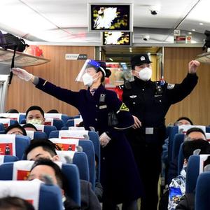 2月14日,在合肥南站,列车长刘璐(左一)对乘务人员进行点名。