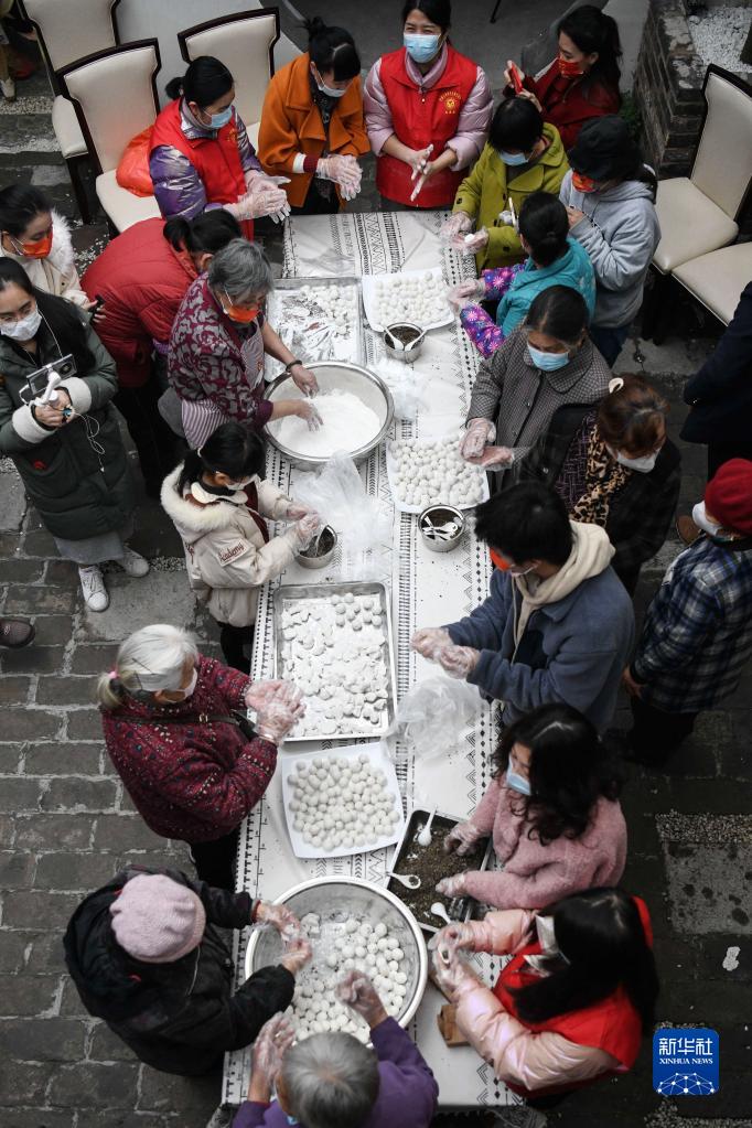 2月15日,在广西钦州市百年老街,市民们搓汤圆、包饺子庆祝元宵佳节。