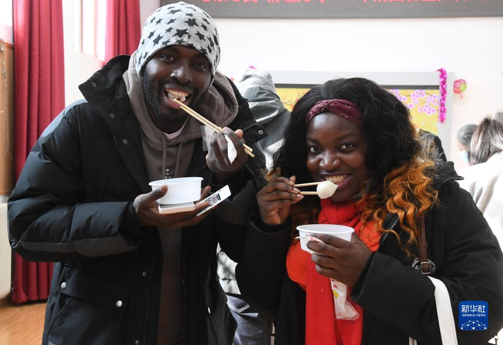2月15日,在位于北京市海淀区中关村街道的华清园社区服务站,外国留学生在社区组织的庆元宵活动中品尝汤圆。