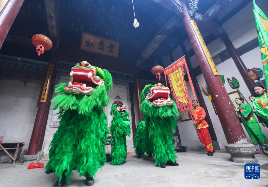 2月15日,绿狮花灯队在浙江省杭州市淳安县屏门乡齐坑村老祠堂表演。在齐坑村举行的闹元宵活动上,杭州市级非遗项目“齐坑绿狮”和花灯环游等表演让游客和村民感受传统文化的魅力。