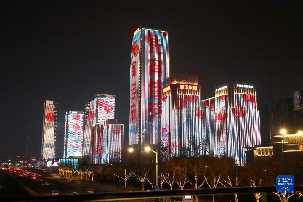2月15日,山东省济南市的建筑群亮灯庆贺元宵佳节。